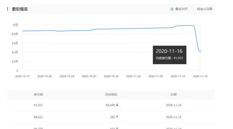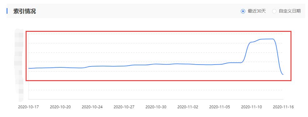 根據(jù)百度站長平臺(tái)提供的索引情況截圖來看,11月16日這天大量網(wǎng)站索引量出現(xiàn)斷崖式下跌的情況,可以說相當(dāng)慘烈,如下: