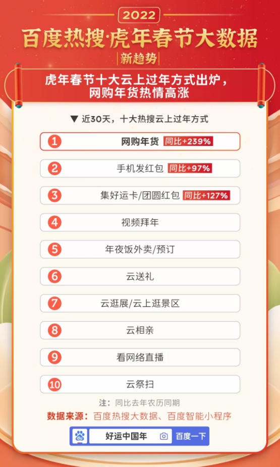 今天,百度發(fā)布《2022虎年春節(jié)百度熱搜大數(shù)據(jù)》。數(shù)據(jù)顯示,今年春節(jié)的十大熱搜話題中,“疫情最新動(dòng)態(tài)”和“就地過年”依然是最熱的兩個(gè)話題。